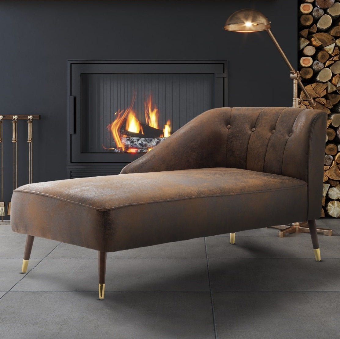 Introducing the Faux Leather Suede Brown Marilyn Chaise Lounge – Left-Hand Facing from Stunning Chairs – a beautiful and luxurious addition to any living space. This chaise lounge chair features a sleek and modern design with a buttoned back and is upholstered in high-quality faux leather suede material. The pocket sprung seats provide exceptional levels of comfort, while the hardwood frame and stylish wooden feet with golden tips offer stability and durability.